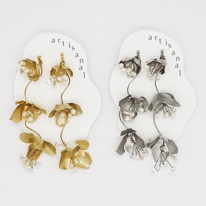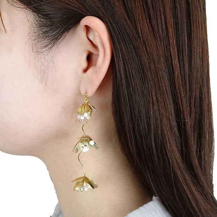 フォトウェディングやセレモニーで活躍しそうな、淡水パールやガラスビーズなどを贅沢に使用したこだわりの手仕事を詰め込んだピアス。