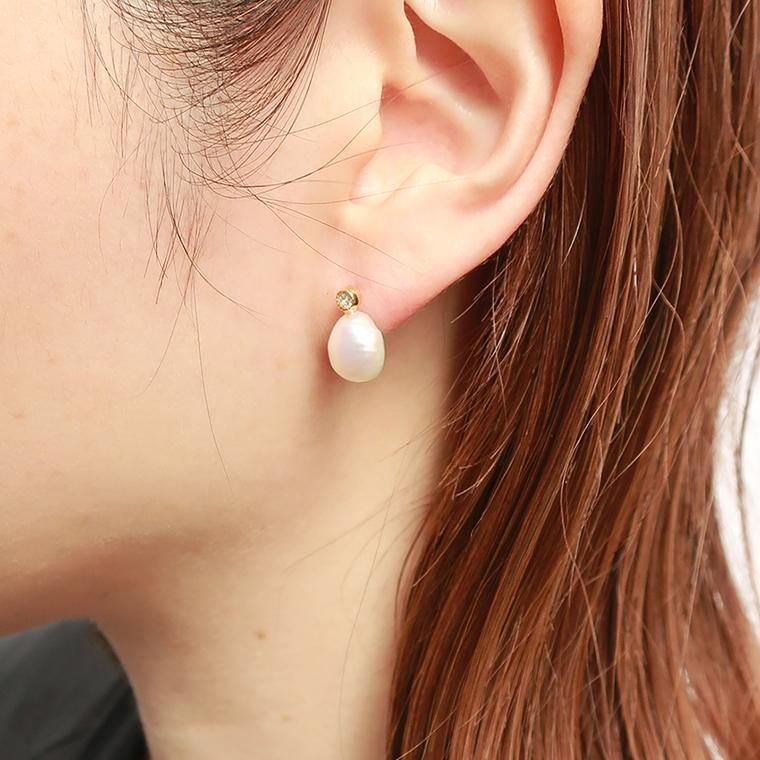 ガラスの付いたポストにバロック淡水パールを付けたピアス。不定形な形が魅力であり、自分だけのパールとの出会いをお楽しみください。
