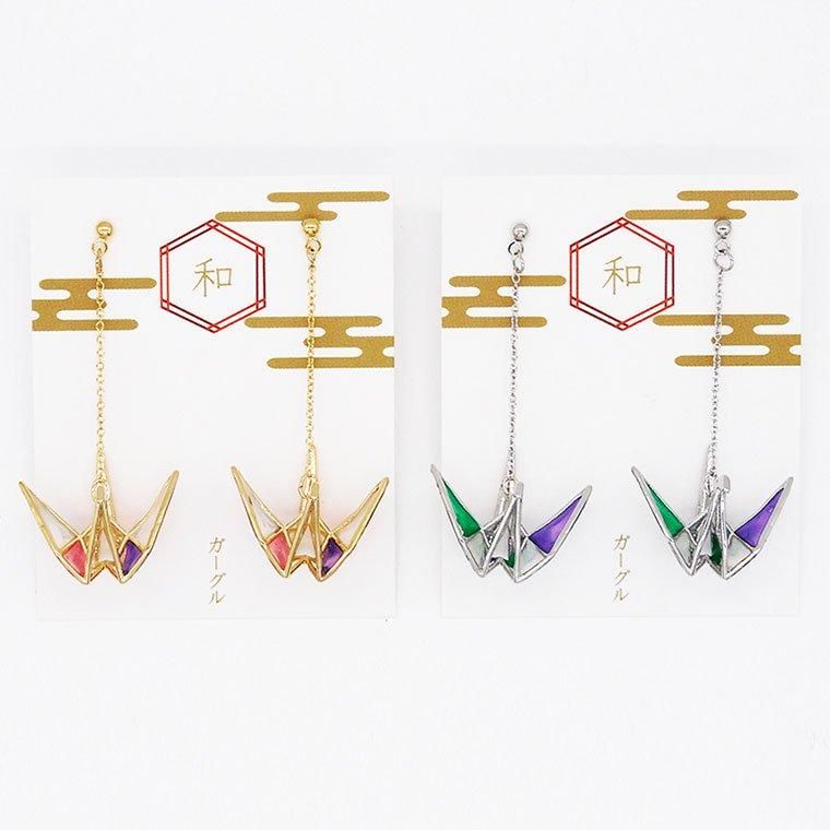 折り鶴をステンドグラスのように色付けしたピアス。小さな鶴が可愛らしく、平和のシンボルでもある縁起の良いピアスです。