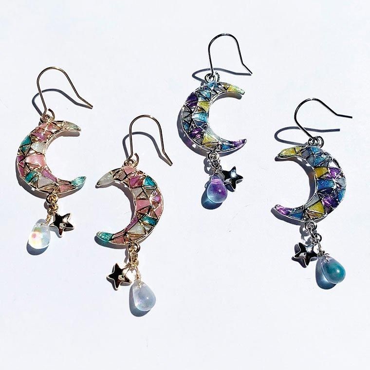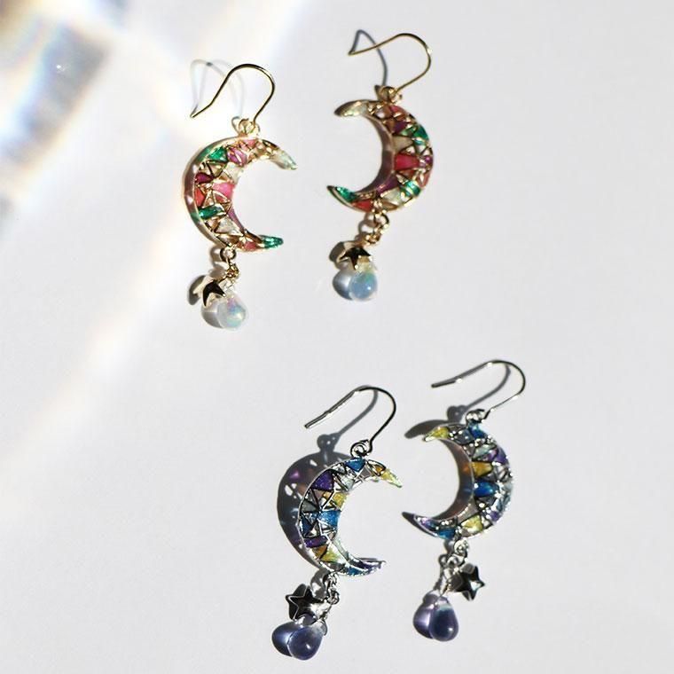 神秘的な色合わせの月にグラデーションの綺麗なガラスを合わせたピアスです。