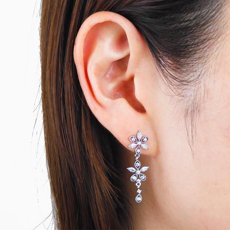 高級感のあるキュービックジルコニアがあしらわれた、大人もつけられるかわいいロングお花のピアスです。プレゼントにもオススメです。