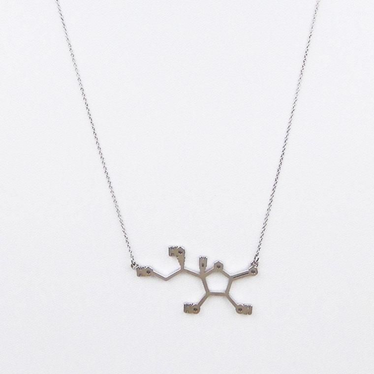 ビタミンCの構造式をアクセサリーにしました。複雑な構造式が幾何学模様のようにも見え、オシャレな雰囲気も感じさせてくれます。