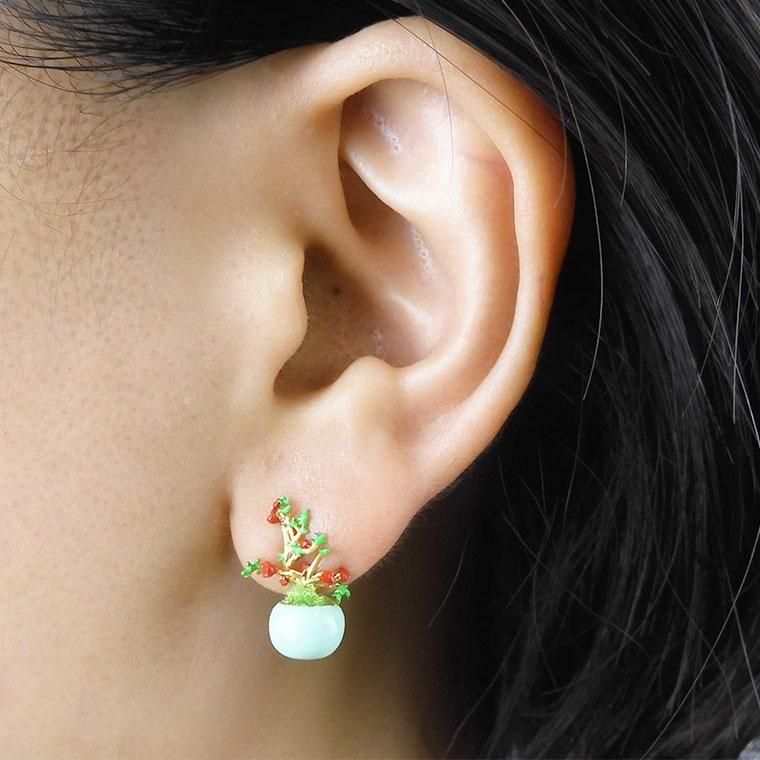 小さな鉢にそっと収まった盆栽をそのままミニチュアに。見ているだけで癒される、ほっこりかわいいピアスです。