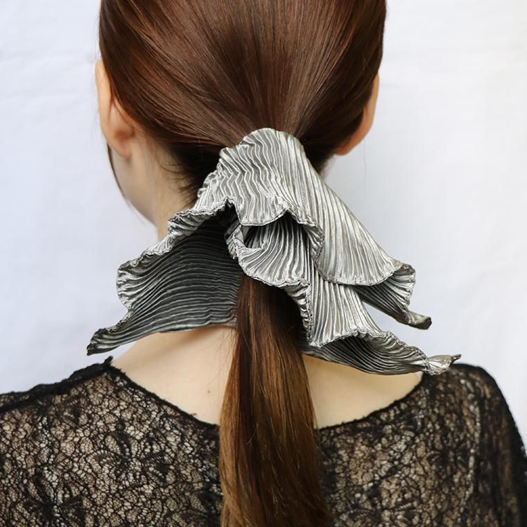 サテンのプリーツ生地を使ったスクエア型のシュシュ。程よくボリュームがあるのでポニーテールやお団子ヘアにプラスするだけで華やかな後ろ姿に。
