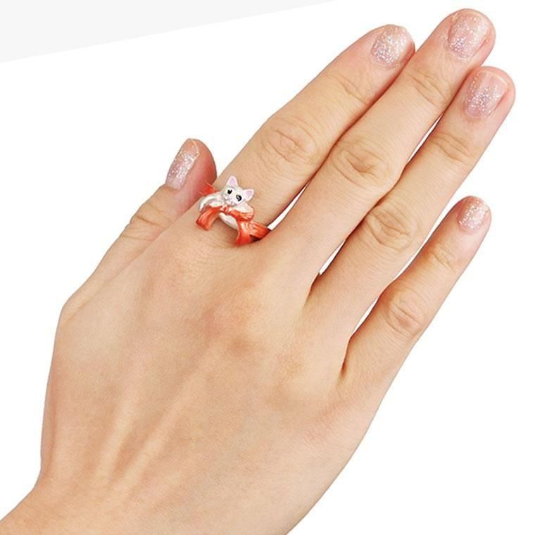 指に結びつくようなリボンのデザインが可愛らしく、リボンと戯れる子猫の表情にこだわったリングです。
