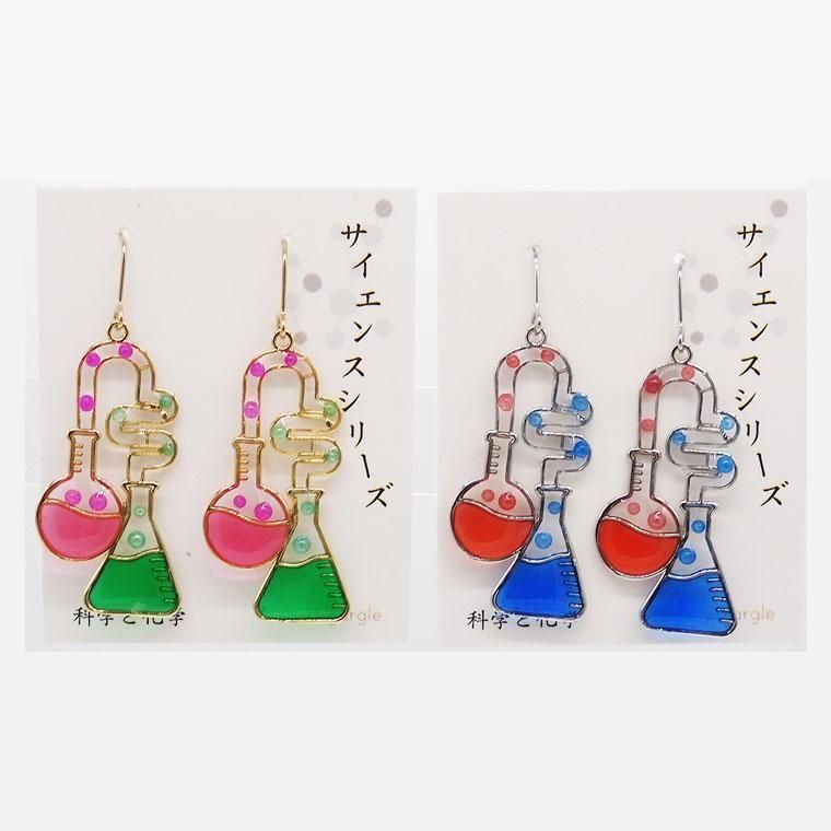 ビーカーやフラスコなどの理科器具をモチーフにした遊び心いっぱいのデザインピアス。ポップなカラーリングがコーディネートのアクセントになり、理系女子にもおすすめ。