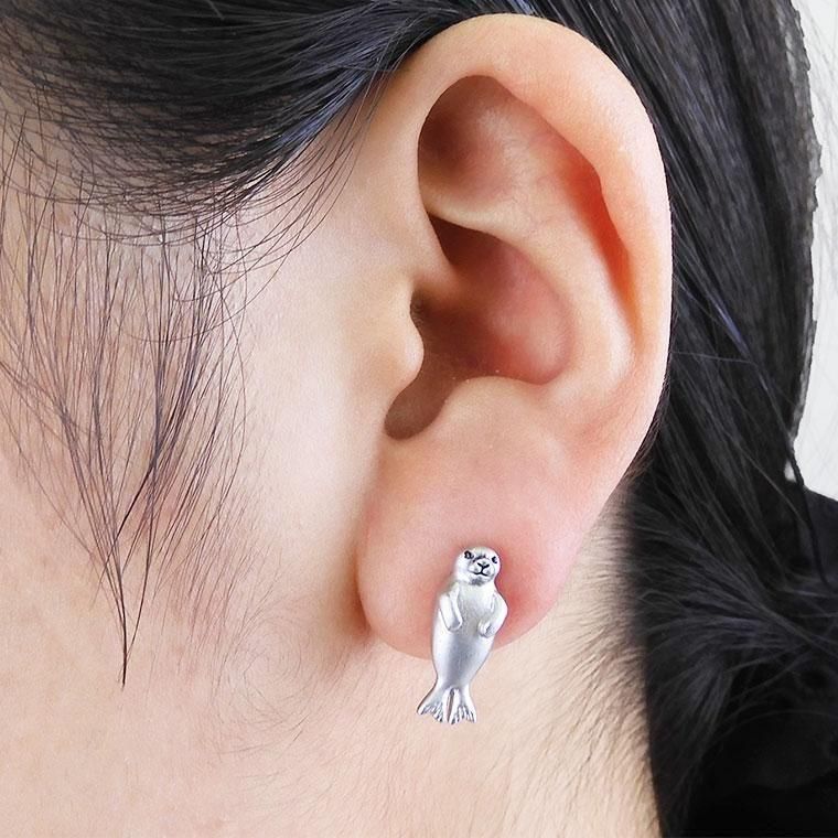 直立したアザラシをモチーフにした、ユニークなデザインピアス。