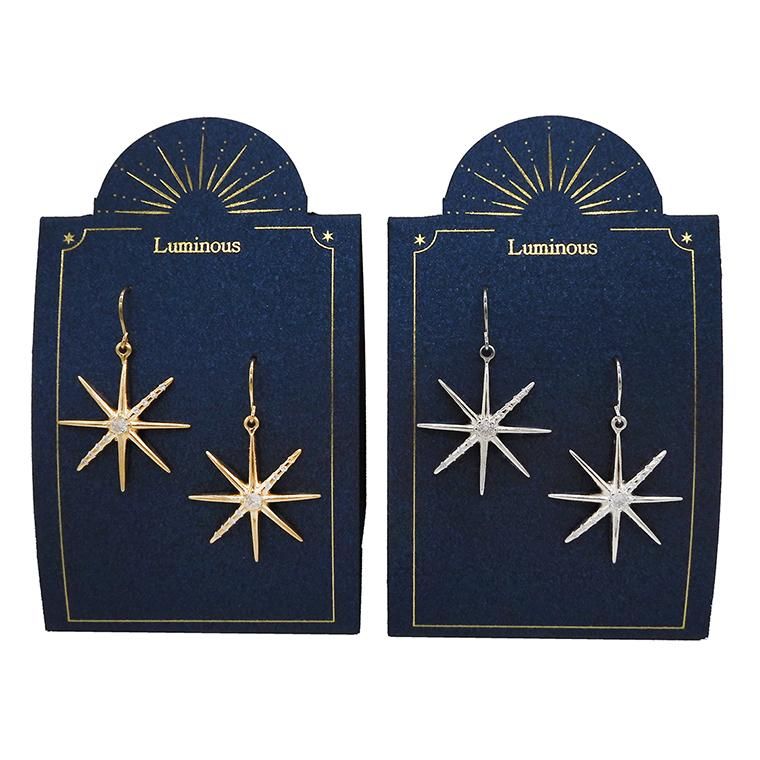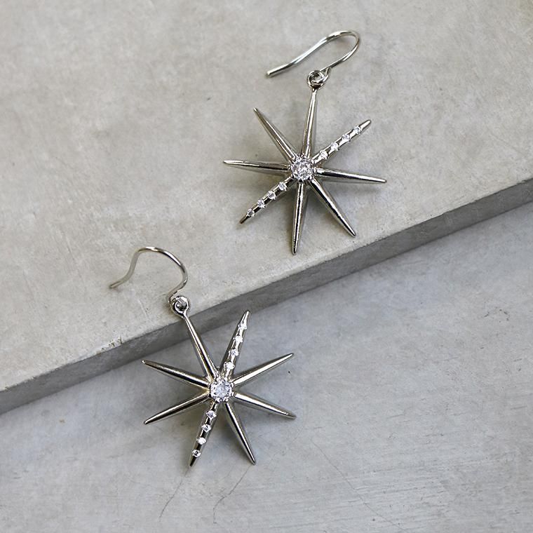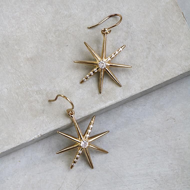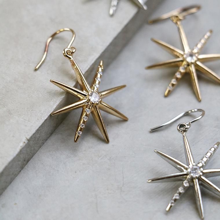 細身のラインで描かれた大ぶりの星モチーフに、キュービックジルコニアを埋め込んだピアス。 繊細なきらめきと星のシルエットが耳元を華やかに彩ります。