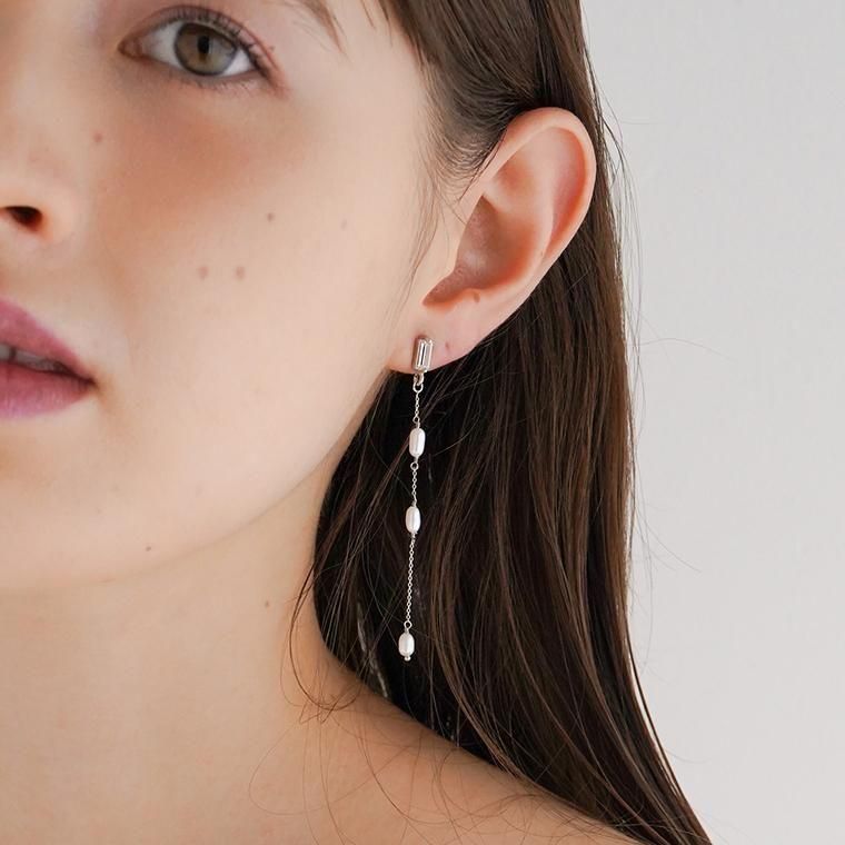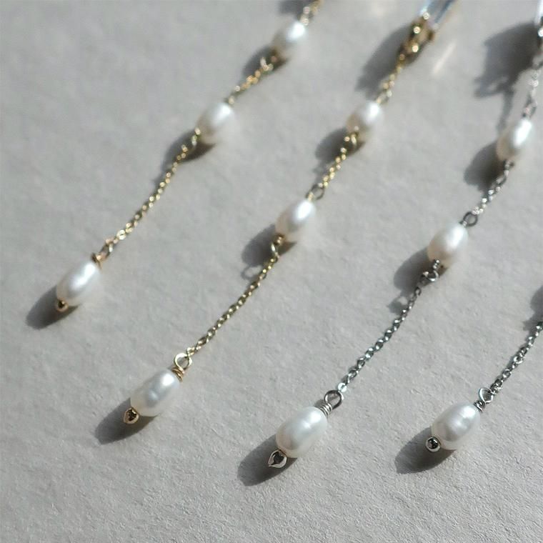 淡水パールのナチュラルな輝きが魅力のロングチェーンピアス。ひとつとして同じ形のない淡水パールの素朴な美しさが、耳元で上品に揺れます。