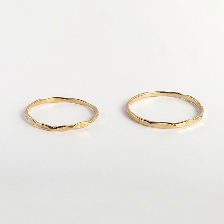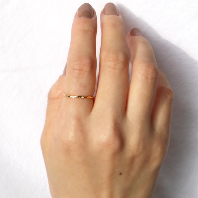 通常のメッキより約20倍以上の1ミクロン厚のコーティングを施したリング。変色しにくく、長く輝きを保ちます。他のリングとのレイヤードスタイルもおすすめ。華奢なデザインなので、主張しすぎず絶妙なバランスで手元をおしゃれに彩ります。